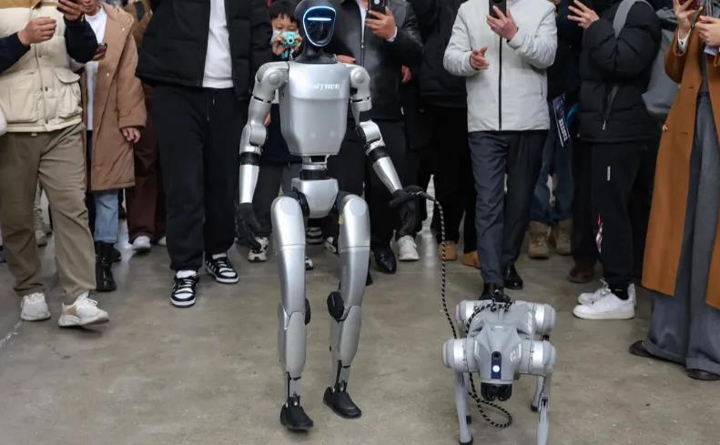 宇树人形机器人“遛狗”,引起观众围观。赖鑫琳 摄