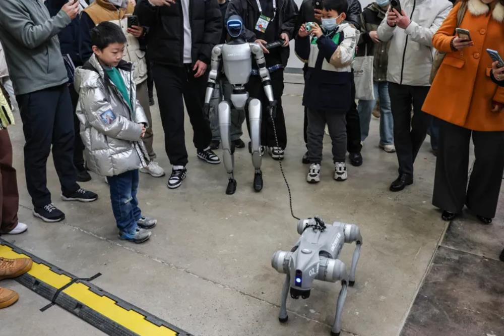 宇树人形机器人“遛狗”,引起观众围观。赖鑫琳 摄
